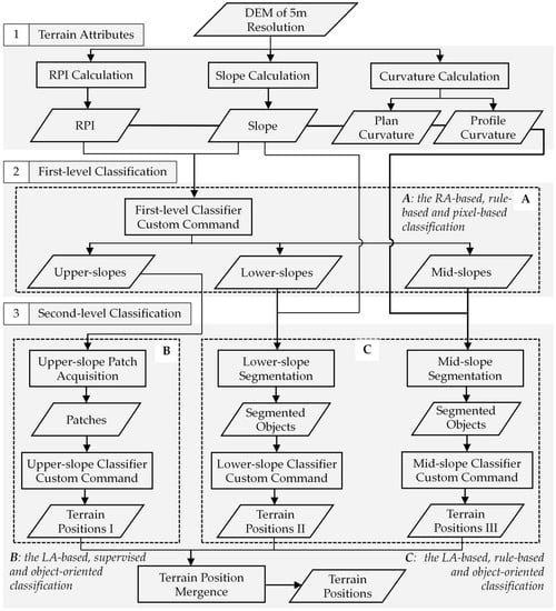 In this work, we integrate various terrain-position classification methods and design a multimodal classification approach as illustrated in Figure 2. Firstly, the regional and local terrain attributes are calculated from a DEM to provide the input for the following two-level classification. Secondly, combining the RA-based, rule-based and pixel-based classification methods, the slopes are classified into upper-, mid- and lower-slopes from the top to the bottom. Thirdly, by integrating the LA-based, supervised and object-oriented classification methods, ridges and hillocks are reclassified from the upper slopes. Meanwhile, the mid slopes are reclassified into shoulders, side slopes, nose slopes, head slopes and back slopes via comprehensive application of the LA-based, rule-based and object-oriented classification methods. Similar to classifying mid slopes, the lower slopes are reclassified into valleys and lower flats. Finally, the rationality assessment of the classification is performed by considering the distribution characteristics of terrain attributes at different terrain positions.