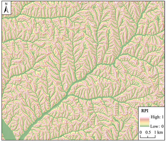 To identify terrain positions, local terrain attributes (e.g., elevation, slope and curvature) are often utilized individually or compositely in different ways according to definite rules [14,15,16,17]. In order to overcome the defect of applying local terrain attributes with a fixed-size window, Weiss [18] presented the topographic position index (TPI) to classify terrain positions based on the fact that landforms are mostly a scale-dependent phenomenon. Although TPI compares the elevation of each cell in its surrounding area with two different window sizes, it is essentially a local terrain attribute. In addition, Jasiewicz et al. [19] proposed a geomorphons approach that serves many ternary patterns as the archetypes of landform elements via counting the elevation differences in a certain neighborhood. To reflect the terrain information of a location in a region, Skidmore [1] developed a regional terrain attribute, namely the relative position index (RPI), to provide an approximate estimate of how far a location is from a ridge or a valley. This approach is more suitable for reflecting the geographical meanings of terrain positions.