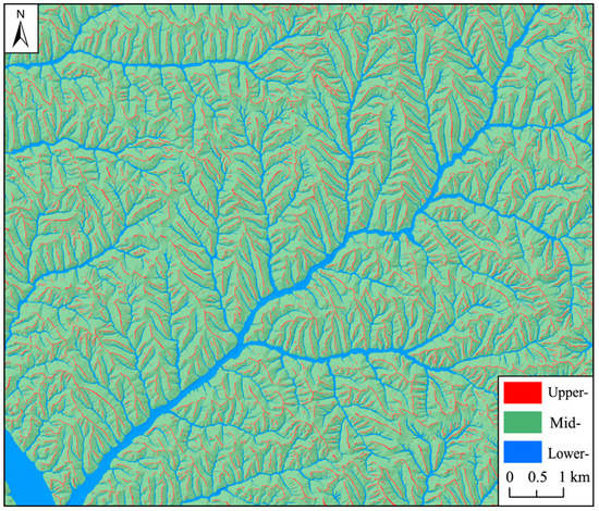 Following the multiple comparative analysis, we adopt 20,000 mm as the flow accumulation threshold to extract the channel network. After the extraction of ridges and valleys, the RPI distribution is finally obtained, as shown in Figure 4. As the regional terrain attribute, the continuity of RPI is found to be relatively good and exhibits gradual change from the upper to lower slope parts, which complies with the requirements of the first-level classification. The relationship between RPI and slope gradient is illustrated in Figure 5. Figure 5a shows that the average slope remains almost unchanged when RPI is less than 0.03; after that, it starts to increase rapidly. As depicted in Figure 5b, the variation curve of the average slope becomes gentle when the corresponding RPI exceeds 0.97. Therefore, 0.03 and 0.97 are selected as the break/critical values for the upper, mid and lower slope classifications. In another word, the values of α and β in Table 1 are 0.03 and 0.97, respectively. Accordingly, the terrain positions at the first level are acquired using the definite rules via the pixel-by-pixel calculation. As presented in Figure 6, the slope is divided into three terrain positions from the upper to lower parts, followed by the distinct boundaries of the terrain positions with almost no fragmentation. Conforming to the basic geo-cognition, the proportion of mid slope area is the largest and the proportion of upper slope area is the smallest. The above results indicate that it is reasonable to comprehensively apply the RA-based, rule-based and pixel-based classification methods to carry out terrain position classification at the first level.