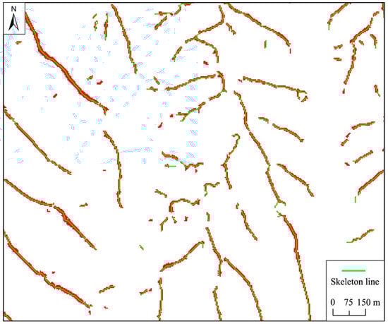 To distinguish the ridges and hillocks, the patches are obtained by merging the adjacent upper slope grid cells in the eight directions, followed by the calculation of the area and aspect ratio of each patch. The area is counted by multiplying the cell number of the patch by the pixel area, and the aspect ratio is calculated via the skeleton-line measurement. The skeleton-line measurement is achieved through three steps: (1) obtain the skeleton line of each patch using a thinning tool in the ArcGIS software; (2) calculate the shortest distance from each patch boundary to its skeleton line and take two times of the distance as the average width of the patch; and (3) further acquire the aspect ratio of each patch from the ratio of the average length and average width, where the average length is equal to its skeleton-line length.