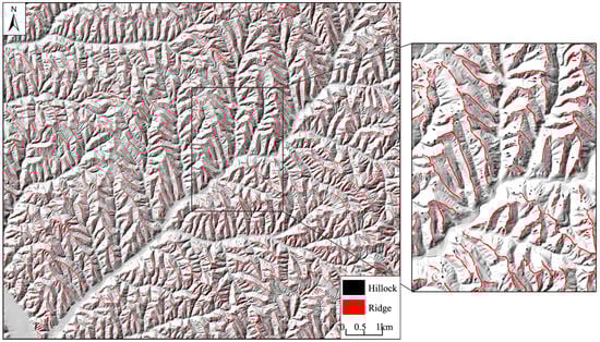 Figure 7 shows that the skeleton lines are located at the center of the patches, reflecting the patch shapes fairly well. This indicates that it is reasonable to adopt the skeleton-line method to calculate the geometric parameters of each patch (i.e., the average length and average width). It is worth noting that it will be difficult to obtain the skeleton line when the number of grid cells in a patch is relatively small, which leads to the relatively small aspect ratio. By analyzing the multiple experimental results, it is found that most of the patches with no skeleton lines belong to the hillocks. This is because that the area and average length of hillocks are both relatively small, which complies with the characteristics of patches for which the skeleton lines cannot be acquired. Therefore, before performing supervised classification to the upper slopes, we first reclassify those patches with no skeleton lines as hillocks. As necessary for the supervised classification, 30 ridge samples and 30 hillock samples, uniformly distributed in the study region, are chosen to train the rules based on the feature space constructed by the area and aspect ratio indexes. By using the maximum likelihood method, the classification of ridges and hillocks is completed (Figure 8). It is evident that the long ridge-like distributed patches with relatively large aspect ratio are reclassified as ridges, and those scattered small patches around the ridges are reclassified as hillocks, which is consistent with the characteristics described in Table 1. The experimental results demonstrate that, by combining the supervised and object-oriented classification methods, upper slopes can be reclassified fairly well into ridges and hillocks at the second-level classification.