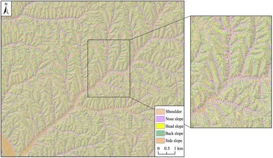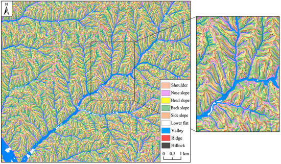 When the object-oriented classification method is applied to reclassify the mid and lower slopes at the second level, the object segmentation should go first. Through the multiple comparative analysis, the optimal segmentation parameters (i.e., segmentation scale, weights of shape and compactness) are acquired for the mid and lower slope segmentations, which are 10, 0.3, and 0.5, and 6, 0.2 and 0.5, respectively. Based on these segmented objects, the mid and lower slopes are successively reclassified into the fine-grained items as defined in Table 1 via the specific rules. At last, the final classification results at the second level are shown in Figure 9. It is found that every type of terrain positions is not fragmented and has good integrity of their boundary, which complies well with the geographical cognition.