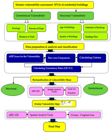 Earthquakes are among the global natural catastrophes that cause severe physical, social, and economic destruction annually. The seismic risks in metropolitan regions are described through the complex terms ‘seismic hazard’ as well as ‘seismic vulnerability’ [1,2]. Studies on seismic hazard analysis (SHA) serve as a conceptual framework for examining the probability of the occurrence of a disaster. However, the concept of ‘vulnerability assessment’ defines the probable effects of dangers on the life of humans and their belongings within a predefined area [3]. Therefore, seismic vulnerability typically exhibits physical, environmental, and socio-economic aspects [4,5]. This is based on the fact that cities are more vulnerable to disaster as a result of huge populations, building stocks, and infrastructure. Therefore, the status of a seismic vulnerability assessment (SVA) in urban areas is crucial to be assessed [6]. Numerous techniques have been suggested by researchers to perform SVA on an urban scale. However, selected studies have employed prevailing analytical relations or vulnerability indices described in the framework for Spatial Decision Support Systems (SDSS) (e.g., refs. [7,8,9,10,11,12,13,14]). However, the outlined approaches are relevant only for predefined relations or directories explained, particularly for the area under the study. The lack of comprehensive building inventory and/or destruction statistics of past earthquakes can be clearly observable for many highly susceptible urban areas. Furthermore, insufficient attention has been given to the implementation of seismic vulnerability assessment methods in areas with limited data availability [15]. Due to the limitation of data and the necessity to assess structural and environmental seismic vulnerability, an applicable solution is to propose SVA for urban residential buildings [2,16]. In this regard, some researchers have employed methods based on Geospatial Information System such as GIS-based Multi-Criteria Decision Making (MCDM) [16,17,18,19,20,21,22]. However, the inherent uncertainties linked to SVA through the MCDM procedures could considerably influence the assessment results. There are limited studies that have considered and addressed the integrated uncertainties. For instance, fuzzy logic was used to evaluate the uncertainties associated with the MCDM procedures, which was approved for the SVA of structures in Los Angeles [2]. Likewise, the human loss maps for the Tehran municipal area (the capital city of Iran) were recorded using sensitivity based fuzzy logic [23]. Other studies have suggested models for SVA in Tehran using the rules of deriving decision based on the technique of granular computing [24]. Similarly, the ordered weighted averaging operator (OWA) was adopted to create a vulnerability map through statistical units for Tehran [25]. In the approaches used to study the seismic vulnerability of Tehran, the vulnerability of each statistical unit has been addressed by experts, individually. In other words, experts rank the selected sample statistical units according to their seismic vulnerability; hence, the defined rules are dependent on individual case study units. Urban earthquake vulnerability assessment of Tabriz city based on the Analytic Network Process and Artificial Neural Network (ANP-ANN) was performed by ref. [26]. The study established a novel hybrid framework for creating a composite vulnerability index based on socio-economic, environmental and physical indices.
