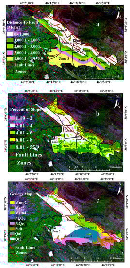 Distribution of (a) Fault systems (b) Slope gradients and (c) Geology map of Tabriz city. Mmg2 = Interlayer of greenish grey marl associated with an interlayer of gypsum- bring sandy marl. Msc5 = Interbedded red conglomerate with sandstone and red marl. Msm4 = Sandstone and red marl. Pldt = Diatomic and fish interbedded with fine particles sediment. Plqc = Interlayer of semi-hard conglomerate associated with sandstone and pumice. Plqc = Interlayer of semi-hard conglomerate associated with sandstone and pumice. Qal = Quaternary alluvium. Qt2 = Young terrace and alluvium deposits.