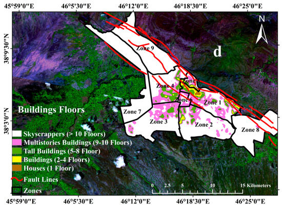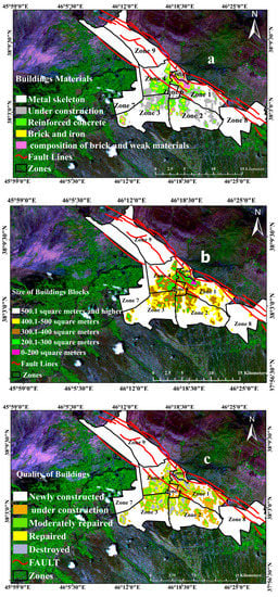 The historic and geographic scope of Tabriz city along with the diversity of its citizen’s livelihoods means that the city is structurally diverse. In general, the structures in Tabriz city comprise of Qajar era buildings which are around 100 years old, merged with villages with other buildings that date back 20 to 50 years, along with new constructions and towers. Consequently, the structural vulnerability of a city with such varied distribution and native structures requires the experiences of past earthquakes, based on the prepared Standard 2800 [36], and studies in the literature [29,32,33,35,64,65,66,67,68]. After extracting significant factors like materials, age, quality of construction, along with the seismic resonance, structural coefficients, and scoring the parameters, the map of structural vulnerability was generated for Tabriz city (Figure 4a–d). It is noteworthy to state that this aspect of the research employed additional categorizations according to Standard 2800. This is a collection of guidelines established at the Building and Housing Research Centre of Iran from past experiences with earthquakes. This is the single most official and scientific material for the design and evaluation method for seismic-resistant structures and determining the seismic vulnerability of earthquake-prone structures. As outlined in the guidelines, the key to the seismic stability of structures is based on the building materials, the size of building blocks, quality of the buildings, and building floors.