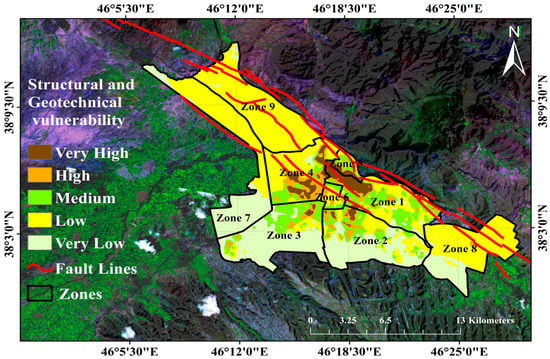 The vulnerability is multi-dimensional, differential and varies across physical space and within social groups. In addition, it is scale-dependent with regards to space and units of analysis such as individual, household, region, or system with dynamic characteristics and driving forces of vulnerability change over time. Vulnerability assessment is a broad concept that can be discussed in several different contexts. However, it is not a variable that can be measured directly but can be assessed indirectly according to a set of dimensions. For assessing urban vulnerability, it is necessary to consider all main dimensions of vulnerability including environmental, physical and socio-economic [71,72]. Physical factors are usually materially oriented arising from the field of engineering, architecture and land use planning. Vulnerability from a physical perspective, despite its broad scope, refers mainly to the consideration and susceptibilities of location and building environment. Environmental vulnerability includes the fraction of the slope, geological features and distance to the fault. The identification of vulnerability and understanding of related methodologies helps the development of policies and action plans for mitigation. Hence, the results can enhance urban policy and scientific based debates as a possible key-element for urban public policies. The main advantage of the research was simplicity in applying the indices, which could be a solution for different stakeholders in vulnerability studies. Thus, vulnerability assessment fits into the general approach of informed decision making which links academic research, policy and practice [73]. Tabriz is located among one of the main seismic (NTF) faults with the high potential of earthquake occurrence. Its residential areas are highly vulnerable to earthquakes due to a dense population, too many structures and violations of construction codes. Thus, in the case of an earthquake, the possibility of a severe damage will increase dramatically. Therefore, developing a seismic vulnerability map is a useful step to take in order to decrease the severity of a major earthquake impact in the area; construction of vital structures such as hospitals and schools. In highly vulnerable areas, limitation and establishment of vital roads can be banned or subject to observing all earthquake engineering principles, seismic regulations and construction codes. Risk mapping is often referred to as an essential tool for reducing the risks of natural and technological hazards [74]. Some investigations have used GIS-based MCDM approaches for SVA of urban residential buildings [16,17,18,19,20,21,22]. While the inherent reservations linked to SVA using the MCDM procedures could considerably affect the concluded results. For that reason, few studies have considered and addressed the integrated uncertainties [23,24,25]. In this study, the vulnerability of residential buildings in Tabriz city (as a case study) was investigated based on geotechnical and structural factors and the selected sub-criteria determined from combined GIS and AHP techniques. This research proposes a new rational approach independent of the study area, using a robust MCDM method, which attempts to treat the incorporated epistemic uncertainties [74]. To achieve this target, three approaches of MCDM were implemented in GIS environment [56]. A new insight on the influencing criteria was introduced in this research, which concerns the influencing criteria in two main categories: (i) structural indicator that considers the building structural properties, and (ii) the criteria that influence ground motion intensity, which takes into account the properties of the ground on which the building is constructed. The datasets pertinent to each category are introduced and implemented in a real case study, which was an earthquake-prone municipality district with high seismic risk. The results of this study suggest that the proposed method is arguably a pragmatic and quick approach to solve the complex problem of SVA under the vagueness uncertainty of the criteria influences physical seismic vulnerability. The results of the implementation also indicated that the proposed model has acceptable robustness concerning the weights of the criteria defined using the AHP method. Since all geotechnical and structural criteria, do not have equal importance and value, the vulnerability of buildings is not effective by inspecting elements individually. Therefore, the correct results can be achieved by addressing all elements concurrently. Next, the geotechnical and structural maps have been overlaid to determine the seismic vulnerability of residential buildings (see Figure 7).
