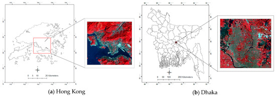 Two study areas (Hong Kong and Dhaka City, Bangladesh) with different geographic characteristics are selected to test the transferability of the proposed indices and to evaluate their robustness in urban land cover classification. The first study site, Hong Kong, has an area of 1095 km2 and is situated between latitudes 22°09′ to 23°37′ and longitudes 113°52′ to 114°30′. It is surrounded by the South China Sea to the east, west, and south, and shares a border to the north with the Guangdong province of China. It is a mountainous area that contains skyscrapers and several country parks. Due to its rugged terrain, a significant portion of the area is undeveloped; therefore, the urban population is squeezed into less than 25% of the area (the built-up area is approximately 260 km2) [53]. For this study, an area of 285 km2 is selected as the study site (see Figure 2a).