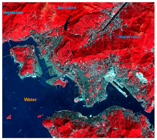 False color image of Hong Kong. Typical land covers: water (dark blue), vegetation (red), bare land (yellow), and impervious (bluish ash).