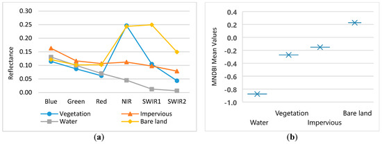 Reflectance of the typical land cover types in the Hong Kong study area: (a) band reflectance and (b) proposed modified normalized difference bare-land index (MNDBI).