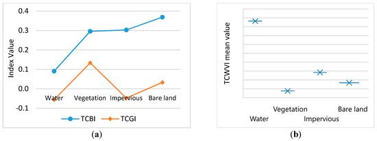 Reflectance of the typical land cover types in the Hong Kong study area: (a) index values and (b) proposed tasseled cap water and vegetation index (TCWVI).
