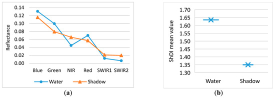 Reflectance of surface water and shadow in the Hong Kong study area: (a) band reflectance and (b) proposed shadow index (ShDI).