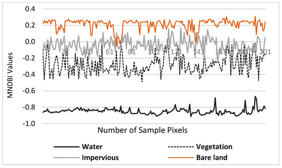 An important step in urban land cover mapping is optimizing the threshold for a particular land cover type when applying the spectral indices. This study uses ground spectral reflectance to optimize the thresholds and then conducts spectral separability analysis. In the first stage, to evaluate spectral separability, 1200 ground sample points, 300 for each land cover type, are collected from the high-resolution ZY-3 images for Hong Kong and the SPOT 6 images for Dhaka. To account for potential variability in the surface reflectance, the ground sample points are randomly selected from the entire study area, and then the spectral values are extracted. In the next stage, the graphical and statistical analyses are used to compute the degree of spectral mean difference and the thresholds between adjacent land cover types. For example, Figure 8 illustrates the distribution of observed MNDBI values in Dhaka. Table 2 shows the statistics of different land cover types identified by the proposed indices.