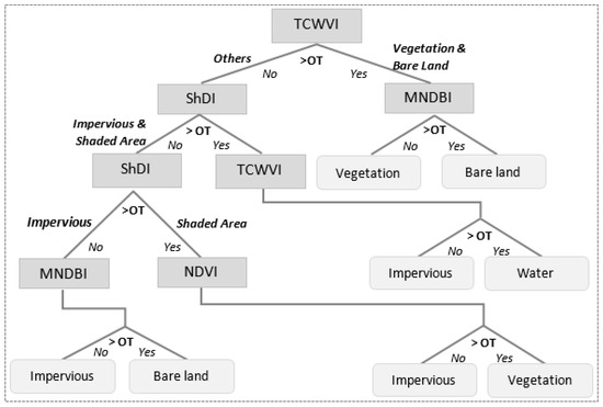 In the proposed framework, the performances of the indices are evaluated, and the threshold is optimized before the land cover is segmented. Then, using an optimized threshold (OT) a decision tree algorithm is implemented to detect land covers. Figure 9 illustrates the workflow of the urban land cover classification procedure using the new spectral indices. The TCWVI index results in vegetation and bare land as adjacent land covers. Thus, in the first stage, the TCWVI is used as the starting node to segregate vegetation and bare land from other land cover types. Second, the optimized threshold of the MNDBI is used to segregate bare land from vegetation. Third, impervious and shaded areas are segregated from water using the ShDI. Fourth, the optimized threshold of the TCWVI is used to enhance water detection. Fifth, impervious and shaded areas are segregated using the ShDI. Notably, the ShDI enhances the separation of shadow from water, however, the complete separation between impervious and shaded areas are not possible using the optimized threshold of the ShDI. Shadows consist of both impervious and vegetative lands thus, after careful examination, finally, NDVI is used to improve the segregation of shaded areas as impervious and vegetation. In the final stage, the threshold of the MNDBI is used to enhance further separation of impervious areas. Finally, the detected land covers types are combined into four classes, as shown in Figure 1. Table 3 summarizes the thresholds of the developed indices for both study sites. The investigation confirms that thresholds of the spectral indices are variable to study sites thus careful consideration should be given when applying this approach of classification to other cities of the world.