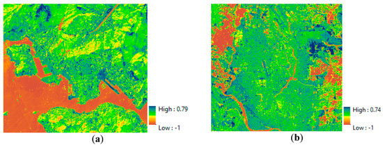 MNDBI-based maps of two study sites: (a) Hong Kong and (b) Dhaka.