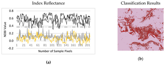This section describes the evaluation of the proposed indices, threshold optimization, and the final classification results. In the first stage, the performances of the proposed indices are evaluated. To evaluate the performance of the MNDBI, two other indices, the NDBI and NDBLI, are used in a comparative analysis. Next, impervious and bare lands are segregated using optimized thresholds for the MNDBI, NDBI, and NDBLI. As a further test, a sensitivity analysis is carried out. The performance of the TCWVI is compared to the performance of the MNDWI and NDVI. First, the accuracy of the TCWVI’s detection of water is assessed by comparing it with the MNDWI. Second, a comparative analysis of the TCWVI and NDVI is performed to assess the accuracy of the TCWVI in detecting vegetation. Finally, quantitative accuracy assessment measures are used to evaluate the indices sensitivity. The performance of the ShDI is also evaluated by comparing the results of the two study sites.