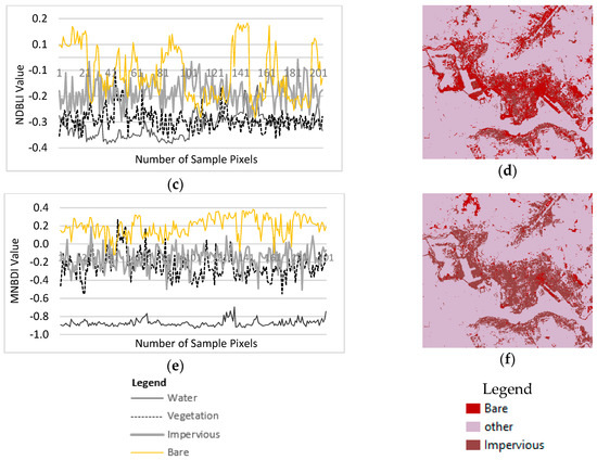 Figure 11 presents the evaluation results of the MNDBI for the Hong Kong dataset. As illustrated in Figure 11a, the impervious and bare land are integrated and the spectral mean difference is not significant; thus, the NDBI is not good enough to separate impervious and bare land. However, the NDBI clearly separates natural features such as vegetation and water from other types of land cover. Figure 11c indicates that, to some extent, the NDBLI can separate bare land from impervious areas but complete separation is still a challenge. As large numbers of areas of impervious and bare land have similar reflectance values, there is a high degree of misclassification of these types, as shown in Figure 11d. However, Figure 11e illustrates that the MNDBI has the highest positive values for bare land and the spectral mean difference between bare land and adjacent impervious areas are significant. Thus, the MNDBI is better at separating impervious and bare land, as shown in Figure 11f.