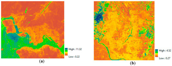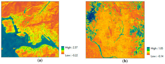 Figure 14 shows the delineated ShDI maps for the Hong Kong and Dhaka datasets. In the Hong Kong dataset, the highest values indicate water, the second highest shadow, and the lowest vegetation (Figure 14a). In the Dhaka dataset, the highest values indicate water, the second highest impervious land, and the lowest vegetation (Figure 14b).