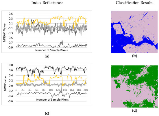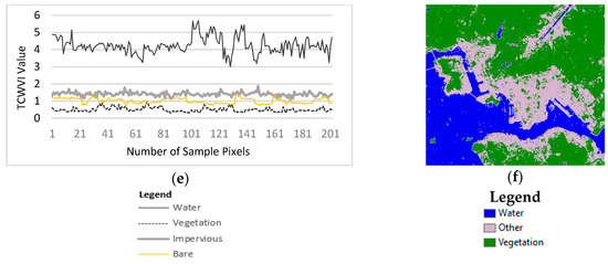 The representative pixels selected in the previous section are used to compute the appropriate index values (Figure 5a). The spectral reflectance illustrates that TCGI has the highest index values for vegetation, but water and impervious areas have almost the same spectral reflectance. In contrast, TCBI has the lowest values for water, whereas vegetation and impervious areas have almost the same reflectance. Thus, combining these indices, as in Equation (2), yields the highest positive values for water and the lowest values for vegetation (Figure 5b). These high and low index values facilitate the simultaneous detection of water and vegetation. Moreover, the proposed TCWVI generates a significant high index value for water that maximizes its separability from other land cover types, thus minimizes misclassification in the detection of water.