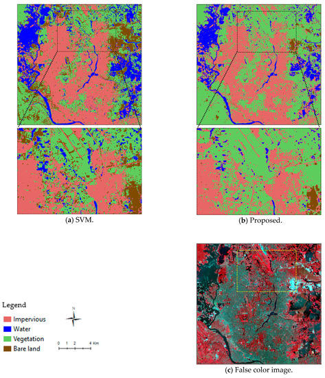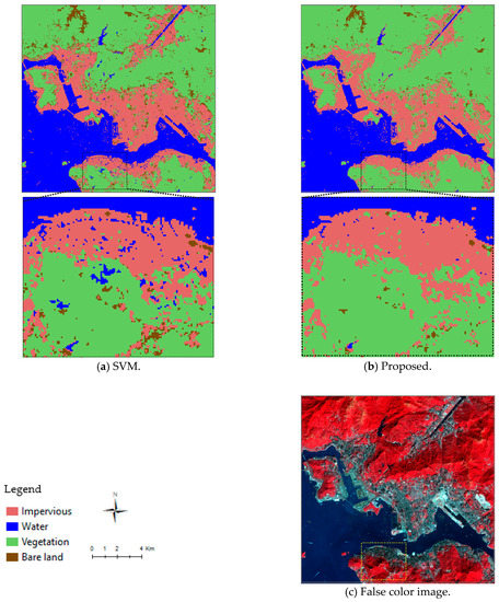 A comparison of the results of the proposed approach and the SVM algorithm for the Dhaka dataset is presented in Figure 17. The results are very similar to those for Hong Kong. The accuracy assessment for the Dhaka dataset, shown in Table 8, indicates that the proposed approach has a better performance than the SVM algorithm. The overall classification accuracy, 94.1% with a kappa coefficient of 0.92, is higher than the classification accuracy of the SVM algorithm. In the Dhaka example, the best performance is in the classification of water and the worst in the classification of bare land. Impervious areas are detected with an accuracy of nearly 94%. Overall, our proposed approach can detect land covers with a level of accuracy that is better than that of the SVM algorithm. However, the proposed approach is slightly more accurate for Hong Kong than for Dhaka.