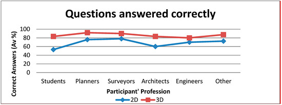 Generally, the entire professional group answered more correct answers in the 3D task as compared to the 2D task. Students performed fairly low in the 2D task (53%), while engineers performed low in the 3D task. Engineers and surveyors however had a very minimal difference in the number of correctly answered questions in 2D and 3D tasks.