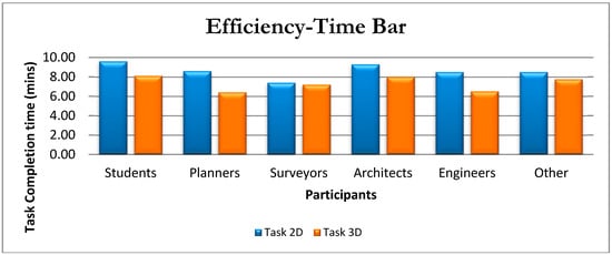 Efficiency measured the effectiveness with respect to the time spent on answering the questions. Planners took a shorter time on average in answering questions related to 3D compared to 2D while the student group took the longest times (12) for both 2D and 3D tasks (