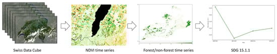 As described in the Group on Earth Observations (GEO)’s document released in 2017, 71 targets and 29 indicators from 16 SDGs can be supported by Earth Observation (EO) []. The Swiss Data Cube has the potential to monitor a wide range of environmental phenomenon, such as urbanization, landslide risks, water, snow, and forest cover changes. For this paper, we chose the SDG 15 concerning the protection and restoration of terrestrial ecosystems and sustainable management of forests to halt land degradation, desertification, and biodiversity loss [], to demonstrate how national data cubes could help countries report their progress towards SDG targets.