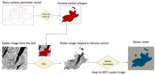 In this first version, the user can choose the extent of the region of interest with geographic coordinates but can also delimit the analysis within specific borders such as cantons. The aim of this procedure is to derive a customizable mask of the area of interest, providing the exact extent of the total surface (i.e., the total number of pixels), which is one of the inputs required in the calculation of the SDG indicator. For this, a binary raster mask must be prepared and uploaded beforehand. The downloaded image is converted to TIF format to facilitate treatment in QGIS or ArcMap software. Figure 2 visualizes the steps towards the creation of the binary raster mask for the area of interest using specific tools of QGIS, like clip and raster calculator. As the script is sensitive to the alignment of pixels between the mask and image scene from the SDC, the binary mask must have the same extent as the selected data array. The mask is based on an image of the area of interest from the SDC in Network Common Data Form (NetCDF) format. This will ensure that the extents are identical, and pixels will be aligned with SDC images.