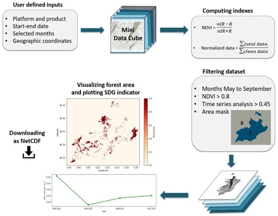 Finally, the algorithm converts the number of candidate forest pixels into forest area (in km2) using the pixel spatial resolution and generates output values in the form of the ratio of forest area over the total land area within the spatial–temporal dimensions specified by the user in order to match the SDG 15.1.1 indicator definition. The results are displayed as a map of forest area for each time period and a graph representing the trend over time of the SDG indicator. Alternatively, the user can also visualize the output maps as an animated GIF and download them in NetCDF. The flow chart of the method is summarized in Figure 3.
