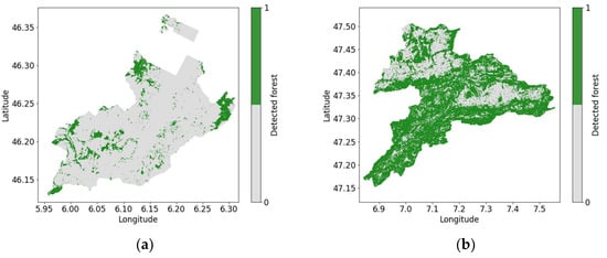 Forest coverage in the canton of Geneva (a) and canton of Jura (b) estimated by the forest detection algorithm. The time period refers to the years 2013–2017.