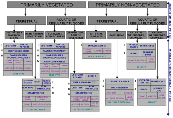 Figure 1 shows that the standard two-phase fully-nested FAO LCCS hierarchy consists of a first-stage fully-nested general-purpose, user- and application-independent 3-level 8-class FAO LCCS-DP legend, preliminary to a second-stage application-dependent and user-specific FAO LCCS Modular Hierarchical Phase (MHP) taxonomy, consisting of a hierarchical (deep) battery of one-class classifiers [16]. The standard first-stage 3-level 8-class FAO LCCS-DP hierarchy is “fully nested”. It comprises three dichotomous LC class-specific information layers, equivalent to a world ontology, world model or mental model of the real-world [13,16,19,20,21,22,23,24]: DP Level 1—Vegetation versus non-vegetation, DP Level 2—Terrestrial versus aquatic and DP Level 3—Managed versus natural or semi-natural. In recent years, the two-phase FAO LCCS taxonomy has become increasingly popular [25]. One reason for its popularity is that the FAO LCCS hierarchy is “fully nested” while alternative LC class hierarchies, such as the Coordination of Information on the Environment (CORINE) Land Cover (CLC) taxonomy [26], the U.S. Geological Survey (USGS) Land Cover Land Use (LCLU) taxonomy by J. Anderson [27], the International Global Biosphere Programme (IGBP) DISCover Data Set Land Cover Classification System [28] and the EO Image Librarian LC class legend [29], start from a Level 1 taxonomy which is already multi-class. In a hierarchical EO image understanding (EO-IU) system architecture submitted to a garbage in, garbage out (GIGO) information principle, synonym for error propagation through an information processing chain, the fully-nested two-phase FAO LCCS hierarchy makes explicit the full dependence of high-level LC class estimates, performed by any high-level (deep) LCCS-MHP data processing module, on the operational quality (in accuracy, efficiency, robustness, etc.) of lower-level LCCS modules, starting from the initial FAO LCCS-DP Level 1 vegetation/non-vegetation information layer whose relevance in thematic mapping accuracy (vice versa, in error propagation) becomes paramount for all subsequent LCCS layers.
