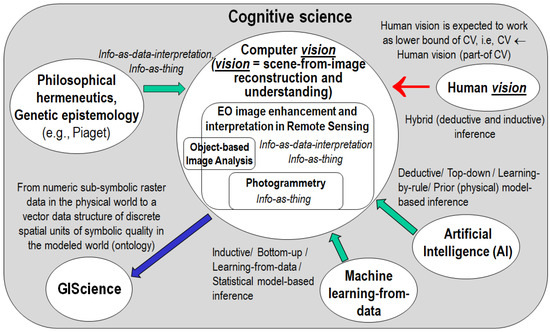 Multi-disciplinary cognitive science domain, adapted from [18,77,78,79,80,81], where it is postulated that ‘Human vision → computer vision (CV)’, where symbol ‘→’ denotes relationship part-of pointing from the supplier to the client, not to be confused with relationship subset-of, ‘⊃’, meaning specialization with inheritance from the superset to the subset, in agreement with the standard Unified Modeling Language (UML) for graphical modeling of object-oriented software [86]. The working hypothesis ‘Human vision → CV’ means that human vision is expected to work as lower bound of CV, i.e., a CV system is required to include as part-of a computational model of human vision [13,76,87,88,89,90,91,92,93,94,95,96,97,98,99,100,101,102,103,104]. In practice, to become better conditioned for numerical solution, an inherently ill-posed CV system is required to comply with human visual perception phenomena in the multi-disciplinary domain of cognitive science. Cognitive science is the interdisciplinary scientific study of the mind and its processes. It examines what cognition (learning, adaptation, self-organization) is, what it does and how it works [18,77,78,79,80,81]. It especially focuses on how information/knowledge is represented, acquired, processed and transferred either in the neuro-cerebral apparatus of living organisms or in machines, e.g., computers. Like engineering, remote sensing (RS) is a meta-science [105], the goal of which is to transform knowledge of the world, provided by other scientific disciplines, into useful user- and context-dependent solutions in the world. Neuroscience, in particular neurophysiology, studies the neuro-cerebral apparatus of living organisms. Neural network (NN) is synonymous with distributed processing system, consisting of neurons as elementary processing elements and synapses as lateral connections. Is it possible and even convenient to mimic biological mental functions, e.g., human reasoning, by means of an artificial mind whose physical support is not an electronic brain implemented as an artificial NN (ANN)? The answer is no according to the “connectionists approach” promoted by traditional cybernetics, where a complex system always comprises an “artificial mind-electronic brain” combination. This is alternative to a traditional approach to artificial intelligence (AI), whose so-called symbolic approach investigates an artificial mind independently of its physical support [77].
