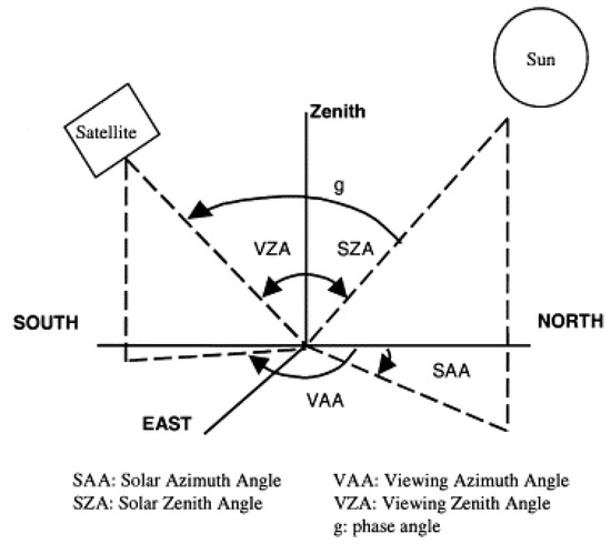 To successfully cope with the five Vs of EO big data analytics, specifically, volume, variety, veracity, velocity and value [4], multi-sensor analysis of multi-temporal multi-angular EO sensory data cubes depends upon the ability to distinguish between relevant changes and no-changes occurring at the Earth surface through time [68,69]. A necessary-but-not-sufficient pre-condition for EO big data transformation into timely, comprehensive and operational EO data-derived VAPS, expected by GEO to be pursued by a GEOSS never accomplished to date [5], is radiometric Cal, considered mandatory by the GEO-CEOS QA4EO Cal/Val requirements [3], but largely oversighted in the RS common practice and literature, e.g., see [6,7]. In short, radiometric Cal guarantees EO sensory data interoperability (consistency, harmonization, reconciliation, “normalization”) across time, geographic space and sensors. In greater detail, the capability to detect and quantify change/no-change in terms of either qualitative (nominal, categorical) Earth surface variables, such as LC classes belonging to a finite and discrete LC class taxonomy (legend), or quantitative (numeric) Earth surface variables, such as biophysical variables, e.g., leaf area index (LAI), biomass, etc., depends on the radiometric Cal of EO sensory data, equivalent to non-negative dimensionless DNs ≥ 0, provided with no physical meaning and typically affected at sensor-level by ever-varying atmospheric conditions, solar illumination conditions, spaceborne/airborne viewing geometries and Earth surface topography, into a physical variable provided with a community-agreed radiometric unit of measure, such as TOARF, SURF or surface albedo values in range 0.0–1.0 [1,2,3]. Solar illumination conditions are typically parameterized by metadata Cal parameters, such as image acquisition time, solar exo-atmospheric irradiance, solar zenith angle and solar azimuth angle, see Figure 3. Sensor viewing characteristics are typical metadata Cal parameters, such as sensor zenith angle and sensor azimuth angle, see Figure 3. Atmospheric conditions are described by categorical variables, such as aerosol type, haze, cloud and cloud–shadow, and by numeric variables, such as water vapor, temperature and aerosol optical thickness (AOT) [68,69]. Finally, Earth surface geometries must be inferred from ancillary data, such as a digital elevation model (DEM), in combination with solar and viewing conditions [107], see Figure 3.