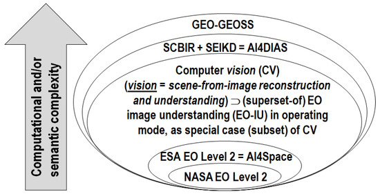 ‘Human vision → CV ⊃ EO-IU in operating mode ⊃ NASA EO Level 2 product → ESA EO Level 2 product → [EO-SCBIR + SEIKD = AI4DIAS] → GEO-GEOSS’.