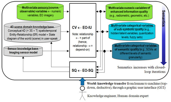 Artificial intelligence (AI) for Data and Information Access Services (AI4DIAS), synonym for semantics-enabled DIAS or closed-loop EO image understanding (EO-IU) for semantic querying (EO-IU4SQ) system architecture. At the Marr level of system understanding known as system design (architecture) [76], AI4DIAS is sketched as a closed-loop EO-IU4SQ system architecture, suitable for incremental semantic learning. It comprises a primary (dominant, necessary-but-not-sufficient) hybrid (combined deductive and inductive) feedback (provided with feedback loops) EO-IU subsystem in closed-loop with a secondary (dominated) hybrid feedback EO-SQ subsystem. Subset-of a computer vision (CV) system, where CV ⊃ EO-IU, the EO-IU subsystem is required to be automatic (no human–machine interaction is required by the CV system to run) and near real-time to provide the EO-SQ subsystem with useful information products, including thematic maps of symbolic quality, such as single-date ESA EO Level 2 Scene Classification Map (SCM) considered a necessary-but-not-sufficient pre-condition to semantic querying, synonym for semantics-enabled information/knowledge discovery (SEIKD) in massive multi-source EO image databases. The EO-SQ subsystem is provided with a graphic user interface (GUI) to streamline: (i) top-down knowledge transfer from-human-to-machine of an a priori mental model of the 4D geospatial-temporal real-world, (ii) high-level user- and application-specific EO semantic content-based image retrieval (SCBIR) operations. Output products generated by the closed-loop EO-IU4SQ system are expected to monotonically increase their value-added with closed-loop iterations, according to Bayesian updating where Bayesian inference is applied iteratively [122,123]: after observing some evidence, the resulting posterior probability can be treated as a prior probability and a new posterior probability computed from new evidence. One of Marr’s legacies is the notion of computational constraints required to make the typically ill-posed non-deterministic polynomial (NP)-hard problem of intelligence, encompassing vision [87], better conditioned for numerical solution [32,33]. Marr’s computational constraints reflecting properties of the world are embodied through evolution, equivalent to genotype [78], into the human visual complex system, structured as a hierarchical network of networks with feedback loops [87,88,89,90,91,92,93,96,97,98]. Marr’s computational constraints are Bayesian priors in a Bayesian inference approach to vision [76,122], where ever-varying sensations (sensory data) are transformed into stable percepts (concepts) about the world in a world model [23], to perform successfully in the world [18].
