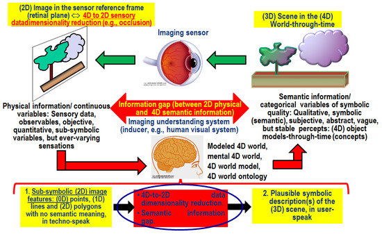 In the multidisciplinary domain of cognitive science (see Figure 2), vision is synonym for scene-from-image reconstruction and understanding [23], see Figure 6. Encompassing both biological vision and CV, vision is a cognitive (information-as-data-interpretation) problem [18], very difficult to solve because: (i) non-deterministic polynomial (NP)-hard in computational complexity [87,116], (ii) inherently ill-posed in the Hadamard sense [117], i.e., vision admits no solution, multiple solutions or, if the solution exists, the solution’s behavior changes continuously with the initial conditions [23,75]. Vision is inherently ill-posed because affected by: (I) a 4D-to-2D data dimensionality reduction, from the geospatial-temporal scene-domain to the (2D, planar) image-domain, e.g., responsible of occlusion phenomena, and (II) a semantic information gap, from ever-varying sub-symbolic sensory data (sensations) in the physical world to stable symbolic percepts in the mental model of the physical world (modeled world, world ontology, real-world model) [12,18,19,20,21,22,23,24], see Figure 6. Since it is inherently ill-posed, vision requires a priori knowledge in addition to sensory data to become better posed for numerical solution [32,33]. For example, in inherently ill-posed CV systems, a valuable source of a priori knowledge is reverse engineering primate visual perception [87,88,89,90,91,92,93], so that a CV system is constrained to include a computational model of human vision [13,76,87,88,89,90,91,92,93,94,95,96,97,98,99,100,101,102,103,104], i.e., ‘Human vision → CV’, see Figure 2. According to cognitive science, AI ⊃ CV is not a problem in statistics [125], which is tantamount to saying there is no (qualitative, equivocal, nominal) semantics in (quantitative, unequivocal, numeric) sensory data [13]. These principles are implicit in the dual meaning of the word “information”, either quantitative (unequivocal) information-as-thing, typical of the Shannon data communication/transmission theory [126], or qualitative (equivocal) information-as-data-interpretation, typical of AI ⊃ CV tasks investigated by philosophical hermeneutics [18].