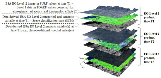 Semantics-enabled EO big data cube, synonym for artificial intelligence (AI) for Data and Information Access Services (AI4DIAS). Each single-date EO Level 1 source image, radiometrically calibrated into top-of-atmosphere reflectance (TOARF) values and stored in the database, is automatically transformed into an ESA EO Level 2 product comprising: (i) a single-date multi-spectral (MS) image radiometrically calibrated from TOARF into surface reflectance (SURF) values, corrected for atmospheric, adjacency and topographic effects, stacked with (ii) its EO data-derived value-adding scene classification map (SCM), equivalent to a sensory data-derived categorical/nominal/qualitative variable of semantic quality, where the thematic map legend is general-purpose, user- and application-independent and comprises quality layers, such as cloud and cloud–shadow. It is eventually stacked with (iii) its EO data-derived value-adding numeric variables, such as biophysical variables, e.g., leaf area index (LAI) [2,131], class-conditional spectral indexes, e.g., vegetation class-conditional greenness index [132,133], categorical variables of sub-symbolic quality (geographic field-objects), e.g., fuzzy sets/discretization levels low/medium/high of a numeric variable, etc. [134].