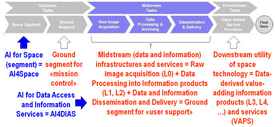 Definitions adopted in the notion of Space Economy 4.0: space segment, ground segment for «mission control» = upstream, ground segment for «user support» = midstream (infrastructures and services), downstream utility of space technology [66] (pp. 6, 57). Cable of transforming quantitative (unequivocal) big data into qualitative (equivocal) data-derived value-adding information and knowledge, AI technologies should be applied as early as possible to the “seamless innovation chain” needed for a new era of Space 4.0, starting from AI4Space applications at the space segment, which include the notion of future intelligent EO satellites (FIEOS) [144,145], and AI4DIAS applications at midstream, such as systematic ESA EO Level 2 product generation, considered synonym for Analysis Ready Data (ARD) eligible for use at downstream.