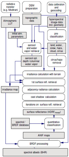 - Bishop, M.P.; Colby, J.D. Anisotropic reflectance correction of SPOT-3 HRV imagery. Int. J. Remote Sens. 2002, 23, 2125–2131. [Google Scholar] [CrossRef]