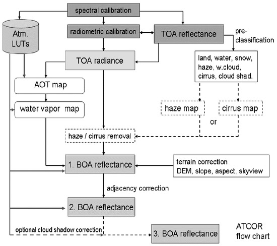 - Chavez, P. An improved dark-object subtraction technique for atmospheric scattering correction of multispectral data. Remote Sens. Environ. 1988, 24, 459–479. [Google Scholar] [CrossRef]
