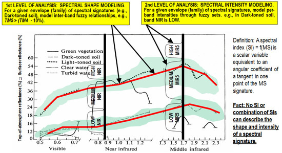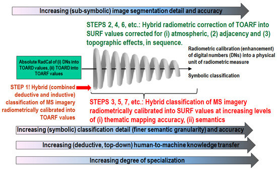 To cope with the five Vs characterizing big data analytics, specifically, volume, variety, veracity, velocity and value [4], radiometric Cal of Earth observation (EO) big data is considered mandatory by the intergovernmental Group on Earth Observations (GEO)-Committee on Earth Observation Satellites (CEOS) Quality Accuracy Framework for Earth Observation (QA4EO) Calibration/Validation (Cal/Val) guidelines [3]. In agreement with the visionary goal of a GEO’s implementation plan for years 2005-2015 of a Global Earth Observation System of Systems (GEOSS) [5], unaccomplished to date, the ambitious goal of the GEO-CEOS QA4EO Cal/Val guidelines is systematic transformation of EO big data cubes into timely, comprehensive and operational EO value-adding information products and services (VAPS). Despite being considered a well-known “prerequisite for physical model-based analysis of airborne and satellite sensor measurements in the optical domain” [1], EO data radiometric Cal is largely oversighted in the RS common practice and existing literature. For example, in a pair of recent surveys about EO image classification systems published in the RS literature in years 2014 and 2016, the word “calibration” is absent [6,7], whereas radiometric calibration preprocessing issues are barely mentioned in a survey dating back to year 2007 [8]. A lack of EO input data Cal requirements means that statistical model-based data analytics and inductive learning-from-data algorithms are dominant in the RS community, including (geographic) object-based image analysis (GEOBIA) applications [9,10] in the domain of geographic information science (GIScience). On the one hand, statistical model-based and inductive learning-from-data algorithms require as input DNs provided with no physical meaning. On the other hand, inductive learning-from-data algorithms are inherently semi-automatic and site-specific [2]. In practice, they require no radiometric Cal data pre-processing, but they typically gain in robustness when input with radiometrically calibrated data.