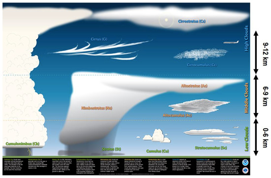 - National Oceanic and Atmospheric Administration (NOAA), National Weather Service. Ten Basic Clouds. Available online: https://www.weather.gov/jetstream/basicten (accessed on 14 November 2018).