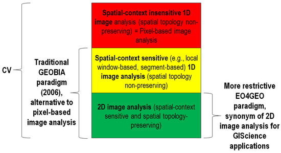 Largely oversighted by the RS and CV literature, an undisputable observation (true-fact) is that, in general, spatial information dominates color information in vision [23]. This commonsense knowledge is obvious, but not trivial. On the one hand, it may sound awkward to many readers, including RS experts and CV practitioners. On the other hand, it is acknowledged implicitly by all human beings wearing sunglasses: human panchromatic vision is nearly as effective as chromatic vision in scene-from-image reconstruction and understanding [13]. This true fact means that spatial information dominates both the 4D geospatial-temporal scene-domain and the (2D) image-domain involved with the cognitive task of vision, see Figure 6. This evidence is also acknowledged by the Tobler’s first law (TFL) of geography, familiar to geographers working in the real-world domain. The TFL of geography states that “all things are related, but nearby things are more related than distant things” [127], although certain phenomena clearly constitute exceptions [128]. Obscure to many geographers familiar with the TFL formulation, the statistical concept of spatial autocorrelation is the quantitative counterpart of the qualitative TFL of geography [13]. The relevance of spatial autocorrelation in both the 4D geospatial-temporal scene-domain and the (2D) image domain involved with vision is at the very foundation of the (GE)OBIA approach to CV, originally conceived around year 2000 by the GIScience community as a viable alternative to traditional 1D spatial-context insensitive (pixel-based) image analysis [9,10]. Unfortunately, rather than starting with background knowledge in the multi-disciplinary domain of cognitive science, the GEOBIA approach was started from scratch by a self-referencing GEOBIA sub-community within the GIScience domain, see Figure 2 [9,10,129,130]. As a consequence of its lack of interdisciplinarity, the GEOBIA community showed an increasing tendency to “re-invent the wheel” in ever-varying implementations of the same sub-optimal EO-IU system architecture, although the CV ⊂ AI communities clearly acknowledge that the key of success of an information processing system lies on outcome and process requirements specification, information/knowledge representation and system design, rather than algorithm or implementation (refer to Section 1) [13,19,76,82,83]. Based on these observations, to enforce a ‘Human vision → CV’ paradigm, see Figure 2, the following original constraint can be adopted to make an inherently ill-posed CV system better conditioned for numerical solution [13].