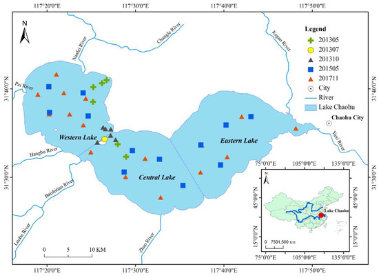The lake has been heavily polluted and suffered from increasing harmful algal blooms since the 1990s. Although several algae species have been observed, cyanobacterial blooms commonly occur from May to November of each year throughout the lake [63,64]. The lake is commonly divided into three parts based on their eutrophication levels; the western part is in severely eutrophic status while the central and eastern parts are considered to be mesotrophic. [65,66].