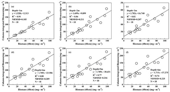 The relationship between algal biomass integrated from surface to 40 cm and total algal biomass integrated from surface to various depth based on in situ measurements. (a–f) represent depth from 1 to 6 m respectively (e.g., in (e), column-integrated algal biomass refers to algal biomass integrated from the surface to 6 m).