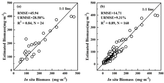 Validation results between in situ measured algal biomass and estimated algal biomass from MODIS observation. (a) results under algal bloom conditions; (b) results under all bloom and non-bloom conditions.