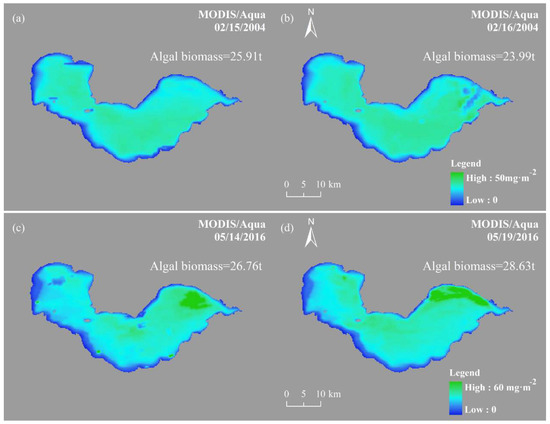Observation from MODIS data on consecutive days demonstrated good consistency (Figure 7a,b). Algal biomass changed from 25.91 t to 23.99 t in February 2004. Satisfying results were obtained with MAPE of 7.41%. Similar results were derived from consecutive images’ observation. Algal biomass on consecutive days ranged from 26.76 t to 28.63 t in May 2016. The variation was 1.87 t with MAPE of 6.98%. A lower error was observed in area integrated algal biomass compared to in situ points. Generally, the high correlation and temporal consistency show the built algorithm was applicable and reliable for both in situ and satellite data.