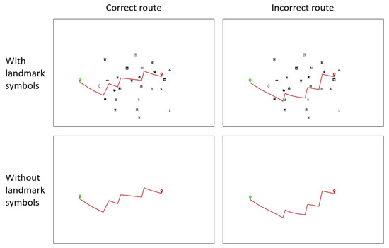 Two variants of each map in both conditions were generated. One variant contained OSM landmark pictograms close to each route diversion as well as at additional random positions in the map. The used landmark pictograms were selected from the OSM landmark pictogram repository based on their salience and meaningfulness [31]. Twenty landmarks with moderate salience and meaningfulness were chosen in order to prevent extensive attention towards single landmark pictograms with higher salience [32] or higher meaningfulness [33]. For each landmark position in the study maps, one of these 20 landmark pictograms was selected at random. The second study map variant contained no landmark pictograms. After the route was inserted and all street names were removed, maps were exported in a size of 30 × 20 cm (1063 × 709 pixels). See examples for both experimental conditions and variants in Figure 1.