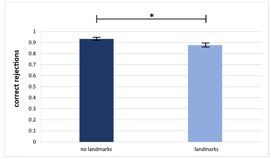 Mean correct rejection difference between the study map landmark conditions. The mean correct rejection of incorrect routes was higher when no landmarks were shown in the study map (MnoLandmarks = 0.931, MLandmarks = 0.882, p = 0.028).