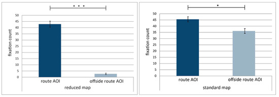 Fixation count differences between the route AOI and the offside route AOI for both map conditions. In both map conditions, fixation counts on the route AOI were significantly higher than fixation counts on the AOI offside the route. In the reduced maps (MRouteAOI = 42.867, MOffsideRouteAOI = 2.724, W = 1, p < 0.001), the difference was larger than in the standard maps (MRouteAOI = 45.506, MOffsideRouteAOI = 36.136, W = 88, p = 0.015).