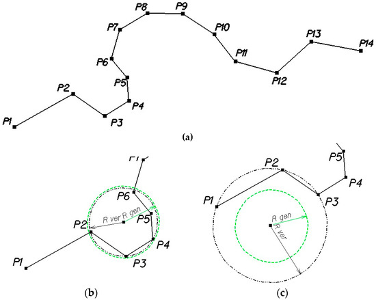 - if the verification radius is greater than or equal to the generic radius Rver ≥ Rgen and ds(PS,PE) > 2 × Rgen, as shown in Figure 1c., then the set of vector line points is left unchanged. The next three vertices are checked, starting from P2;